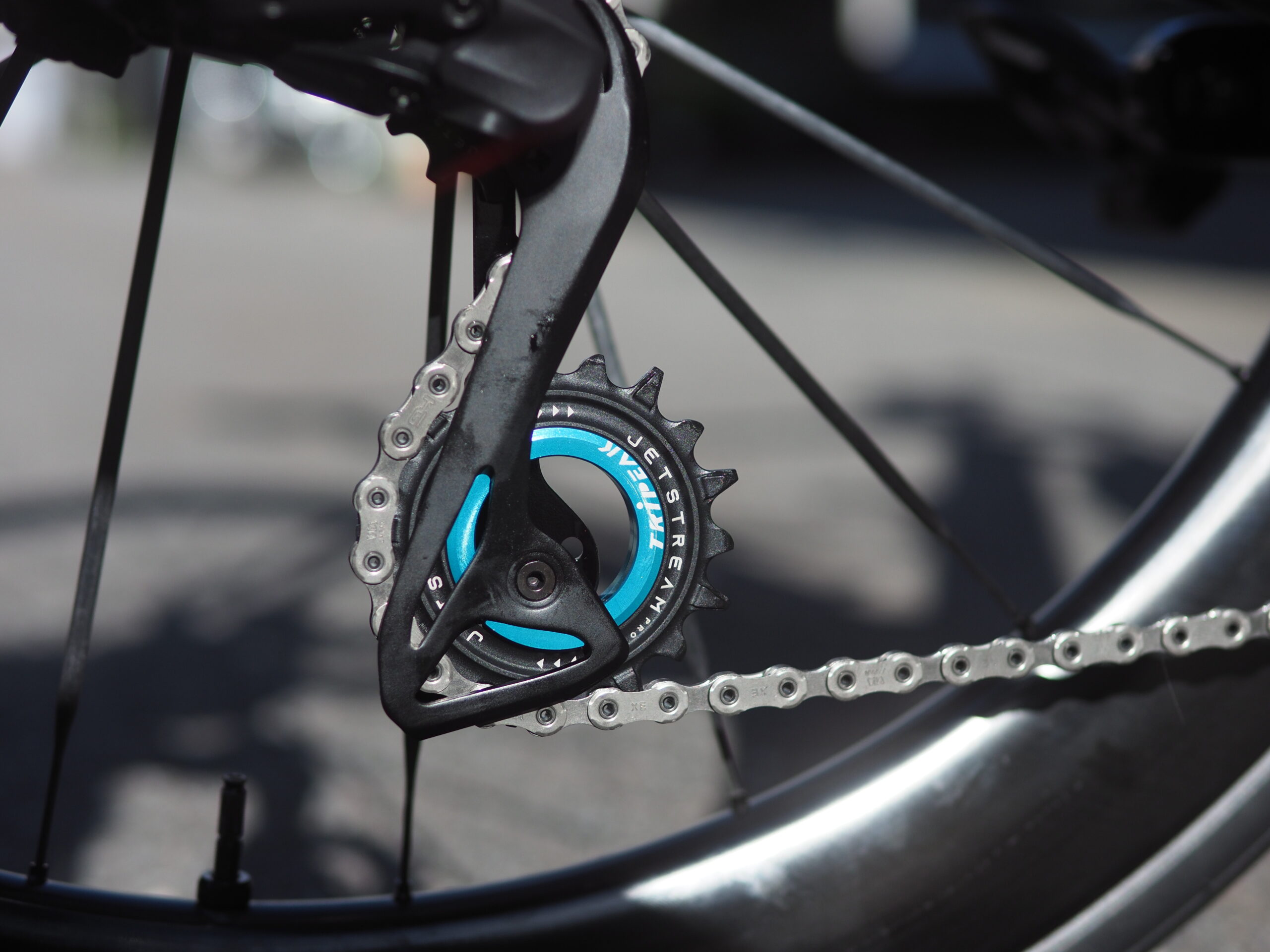 TRiPEAKのJETSTREAMはディレイラーケージをシマノ純正のまま使えるので、変速性能の低下がほとんど見られません。多くのビッグプーリーはプーリーに合わせてケージも大きくなるので、変速時にヨレが発生しやすく変速性能の低下につながっています。