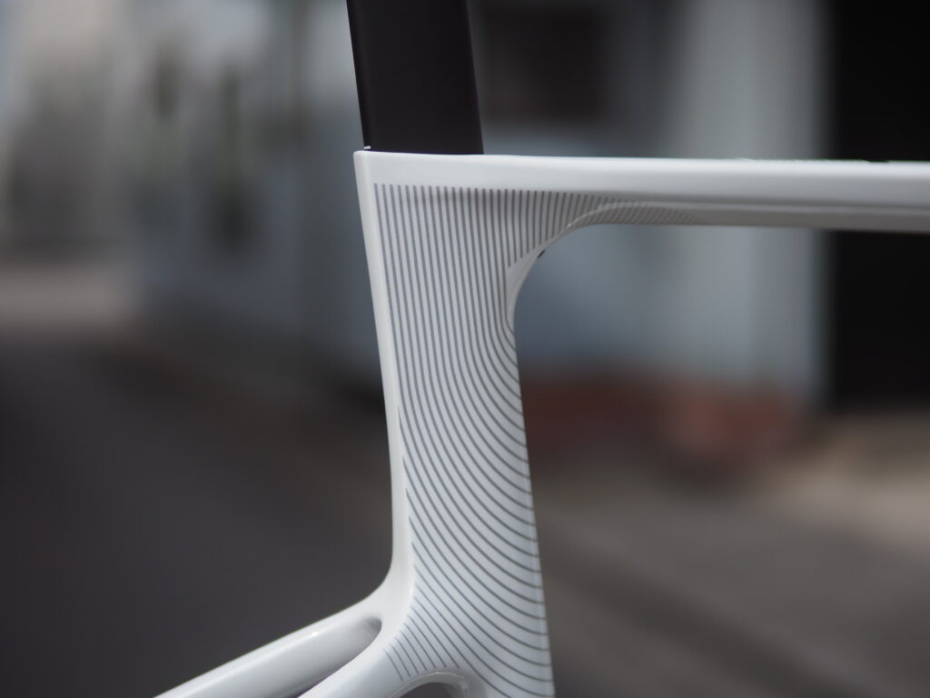 フレーム形状はどのグレードも同じ。違うのは使用しているカーボンのグレードのみです。上のグレードになるほど、少ない材料で剛性を出せる素材を使っているので、フレーム重量が変わってきます。