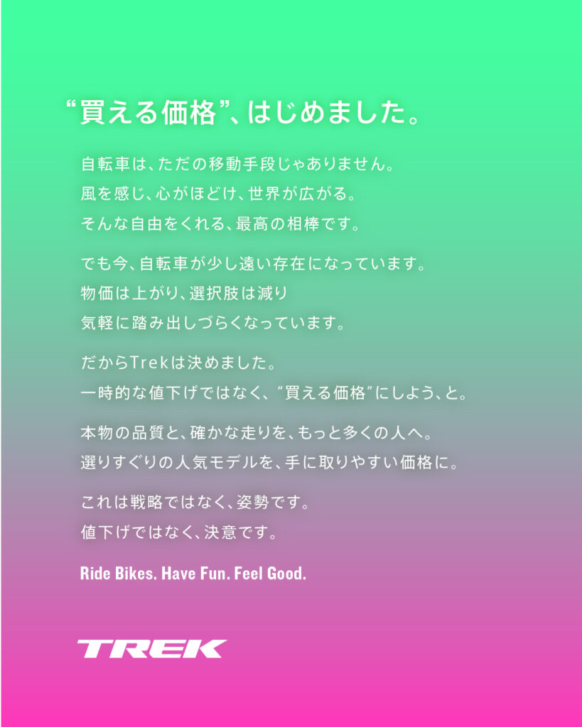 ”買える価格”は単なる一時的な値下げではなく、より多くの方に自転車の楽しさや豊かな時間を届けたい、というトレックの決意表明。